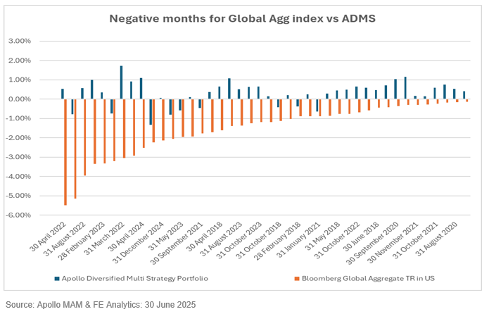 And yet the following chart, drawn from our own Diversified Multi-Strategy portfolio, illustrates the power of adding a well-managed basket of alternatives. Since launch in 2018, our portfolio has consistently held up in months when the Bloomberg Global Aggregate Index has fallen – clear evidence of protection against persistent bond market weakness.