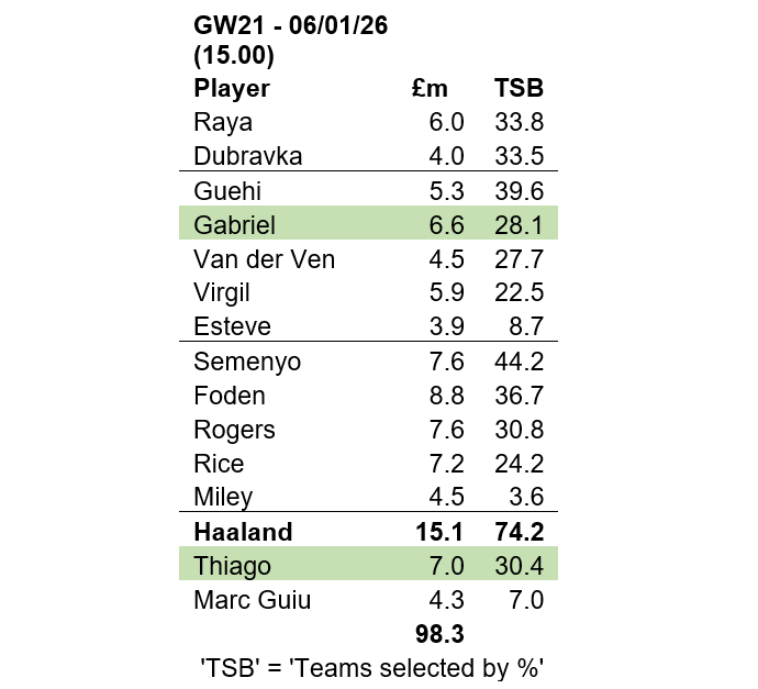 The other recent change to the index, as you can see below, was the reintroduction of Arsenal defender and so-called ‘FPL cheat-code’ Gabriel in place of teammate Timber. The latter’s relegation was largely because we cannot own more than three Arsenal players and there is only so much fancy footwork the portfolio’s advisers can do in a single week. Frankly, they are grateful for the relative peace of an FA Cup weekend.