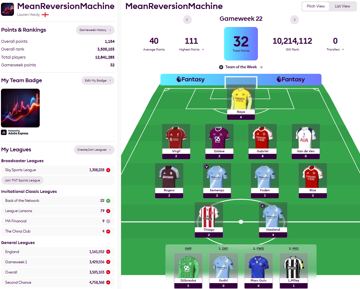 That included his single-point contribution to the portfolio’s dismal score of 32 in Gameweek 22, the full shame of which you can see below. Indeed, aside from a solid defensive performance from the Arsenal duo of Raya and Gabriel, which accounted for almost half our overall score, it was largely a week to forget and MeanReversionMachine finds itself back in second-quartile territory for the season. Where it of course belongs.