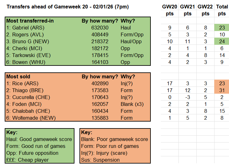 It is a kind little run next of Fulham and Spurs at home and West Ham away so you would expect him to be near the top of next week’s ‘buy’ table too. As for the sells, look at the 31 points missed out on by those who transferred out Thiago ahead of Gameweek 20. That is the joint highest three-week ‘loss’ – tying with Joao Pedro, an old friend of this column, from Gameweek 2. Given Chelsea’s upcoming run of West Ham at home, Wolves away and both Leeds and Burnley at home, can we expect him back in our tables before much longer?