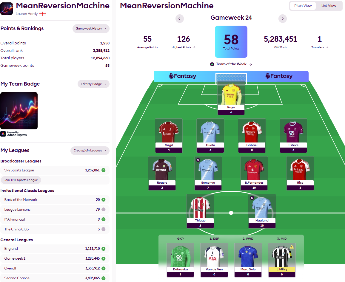 Right, English Literature lesson over, let’s briefly check out the MeanReversionMachine portfolio’s performance last weekend. As you can see below, another bang-average week was raised high by the ongoing good form of Gabriel and Raya of Arsenal, Semenyo of Manchester City and Manchester United talisman Bruno Fernandes – and brought low by, among others, our perma-captain Erling Haaland.