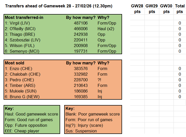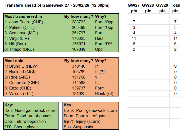Certainly the portfolio could have done with Virgil’s 11 points rather than Chalobah’s two last week – well, it would at least have been enough to turn a deeply underwhelming week into a slightly above-average one. Instead we were left to scrabble by on the ongoing form-and-fixture bounty of Joao Pedro and some more meagre scraps from Haaland, Semenyo and Rice: