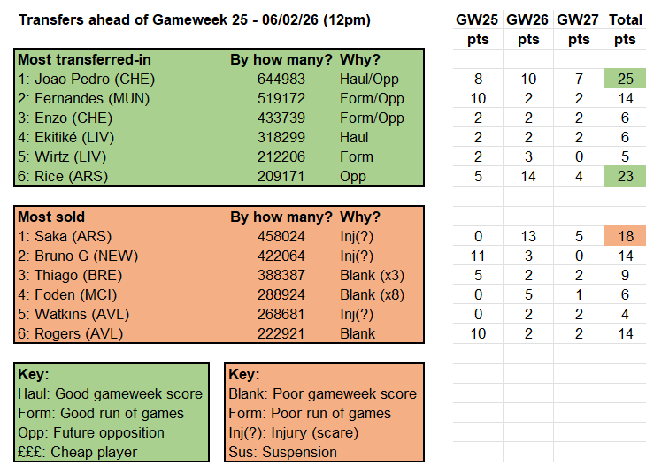 While Rice repaid his buyers’ faith with 14 points that gameweek, backed up with 4 the next, his 18 points are matched by the 13-plus-five of Saka, who was sold by a quarter of a million players before his ‘double’. And while Timber and Zubimendi managed just 14 point between them over the three matches, Gyokeres followed his three points in the ‘double’ with a 13-point haul against Spurs – after being transferred out by a net 200,000 frustrated FPL managers. Weekly schadenfreude fix achieved.