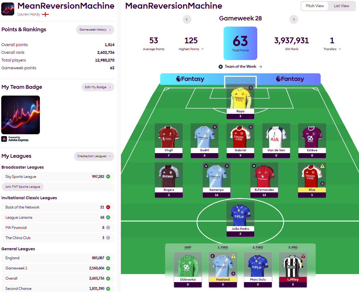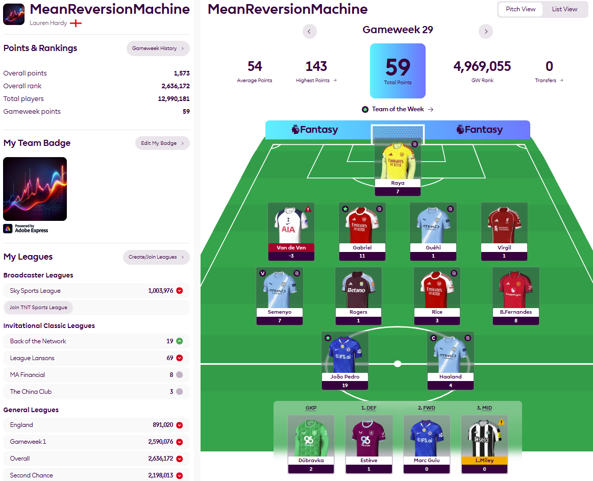I say ‘largely pointless’ because, in a season when most of the ‘premium’ players – Salah, Palmer, Saka, even Haaland – are struggling for the consistent high performance their £10m-plus price tags demand, you would be hard-pressed to make use of that much cash. Indeed, with the Gone-Bissaka mob currently sitting on £19.9m while more than 600 points behind MeanReversionMachine, I rest my case. On a number of levels.