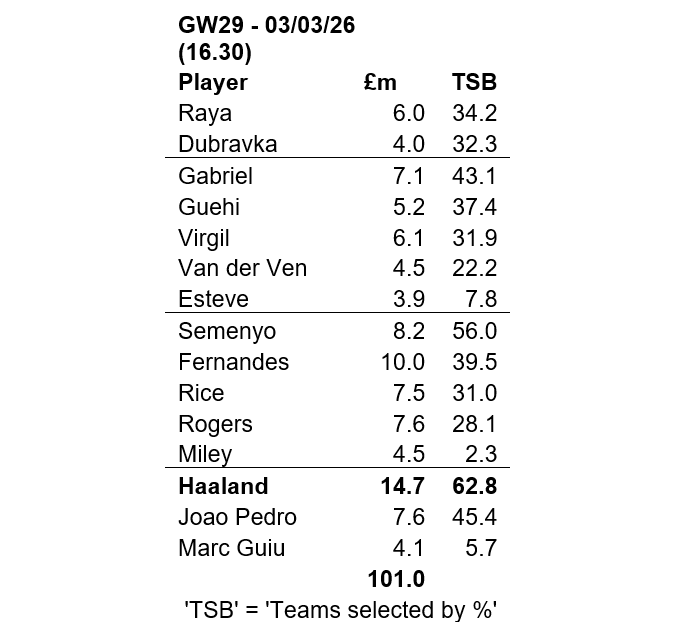 More positively, as you can see below, over both Gameweeks 28 and 29, which fell in quick succession, there were good returns from Gabriel, Semenyo and Bruno Fernandes – while the portfolio’s star asset for the latter gameweek was Joao Pedro and his 19 points. We will look at the Herdwatch tables more closely next week but it is worth musing on the Chelsea striker being the third-most sold player ahead of Gameweek 28.