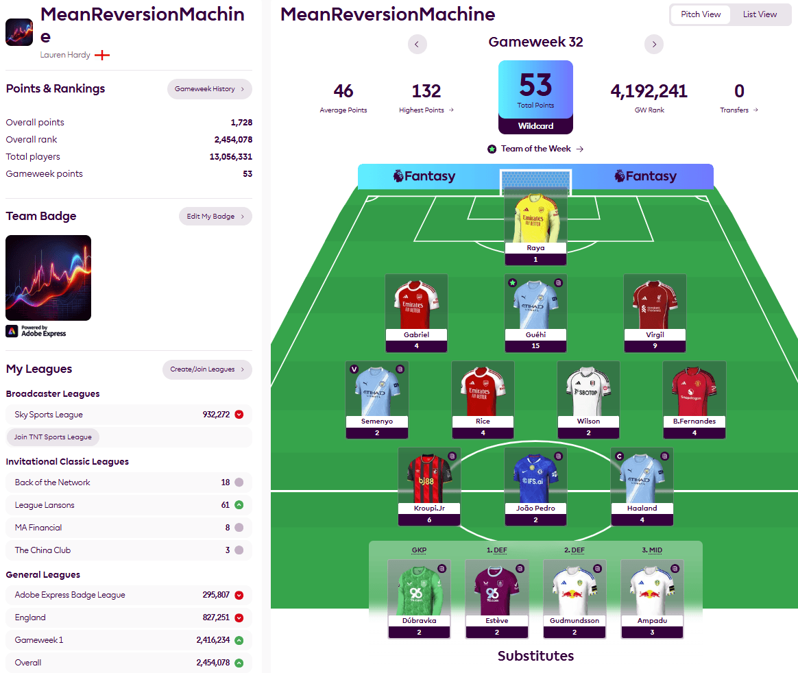Turning to our MeanReversionMachine portfolio, last week’s performance was only elevated above the average by two defenders – Liverpool’s Virgil banking a clean sheet and Manchester City’s Marc Guehi going one better by also channelling his inner-Lineker in the Chelsea six-yard box. Oh – and the bonus of a goal from Bournemouth’s Kroupi Junior, who we had only just brought into the team on our wild card.
