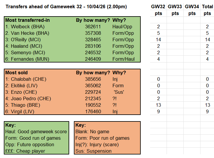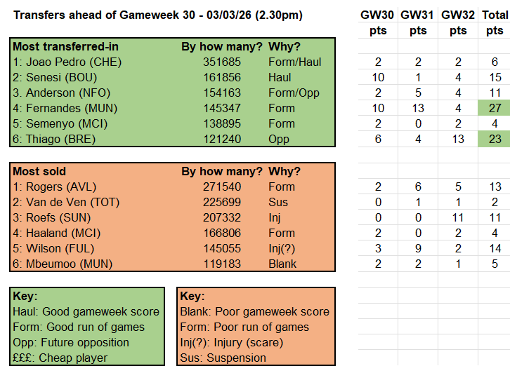 Looking slightly longer-term, the bottom-right table shows the stand-out successes from the big ‘buys’ ahead of Gameweek 30 are Bruno and Thiago – perhaps, not uncoincidentally, the two single-gameweekers most feared by those who have packed their wildcard/free-hit Gameweek 33 teams with doublers. Who scores more? Scott or Bruno? DCL or Thiago? Let the madness commence …