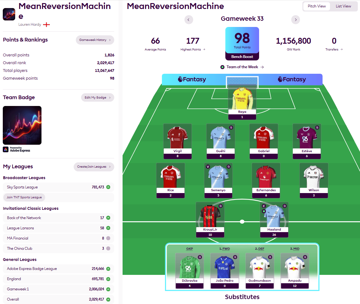 Enough wallowing – given the strict index mandate, 98 points and a jump to our highest overall rank of the season was well beyond the portfolio adviser’s expectations. As you can see below, the returns of our doublers really demonstrated the power of the extra games with Ampadu scoring 3+9, Kroupi Junior 2+8, Gudmundsson 6+1, Guehi 1+7 and captain Haaland doubling up 6+7 to 26. Bruno and Virgil did fine in their single outings.