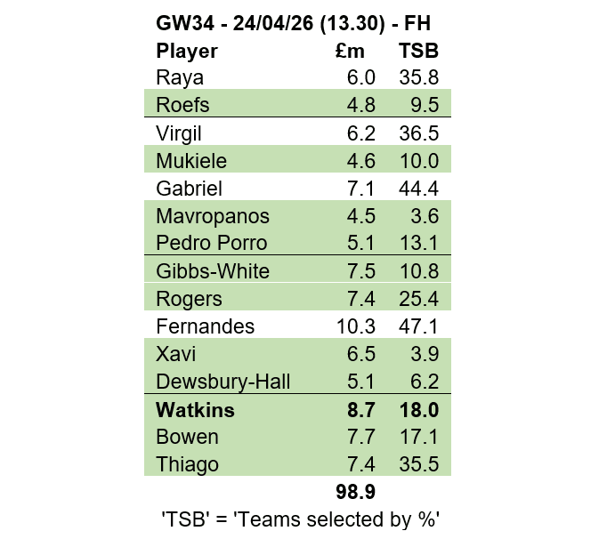 As would always be the case once we went hard on the doublers last time out, we were then left with less than half a portfolio for Gameweek 34 – just Raya, Gabriel, Virgil, Bruno, Rice and Wilson, as shown in the left-hand squad below. Not a problem – that is what the Free Hit chip is for – but how do we index that to this column’s exacting standards? Well, what would you say instead to the right-hand squad? Yes, please?