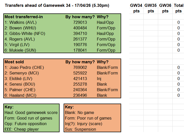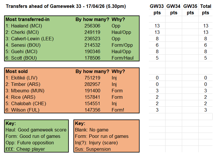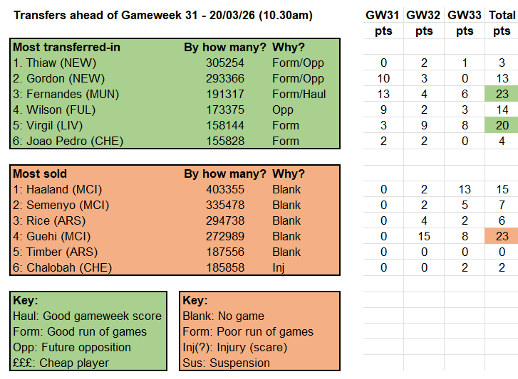 A shade longer-term, as the bottom right-hand table shows, pre-Gameweek 31 investment in Bruno and Virgil has thus far seen greater dividends than backing the Newcastle assets of Thiaw (amid a nervous defence) and Gordon, who is now injured. Conversely, the fire-sale of City players ahead of their blank reaped mixed rewards – fine if you lost Semenyo, rather less so if it was Haaland (clear captaincy material last weekend) or Guehi.