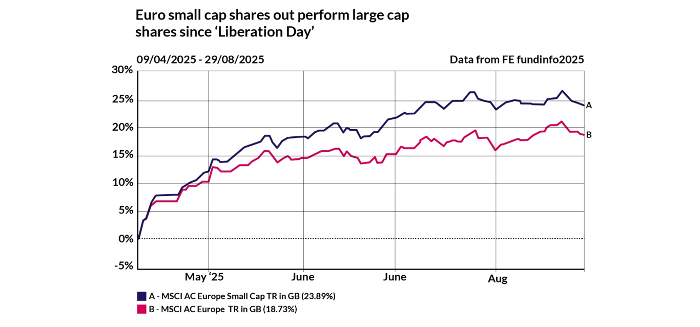 These are more sheltered from tariffs than global large-caps due to their orientation towards domestic markets and cyclical trading environments. Smaller companies in Europe have actually outperformed large-caps recently, with the MSCI Europe Small Cap Index overtaking the wider Europe index during May. As the following chart shows, over the period from ‘Liberation Day’ to the end of August, the smallcap index was some five percentage points ahead of the broader market.
