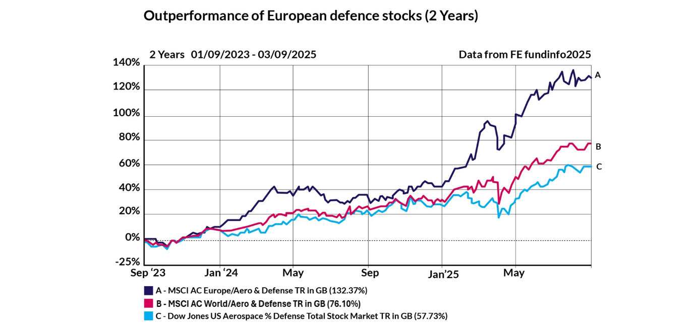 Another important consideration is that peace would be unlikely to interfere with Europe’s defence spending commitments, that have done so much this year to boost defence-related business – as the next chart illustrates. Many believe the primary incentives for investment remain, with the bloc recognising defence was an area of underinvestment before the war – in addition to the opportunity to boost domestic manufacturing it presents.